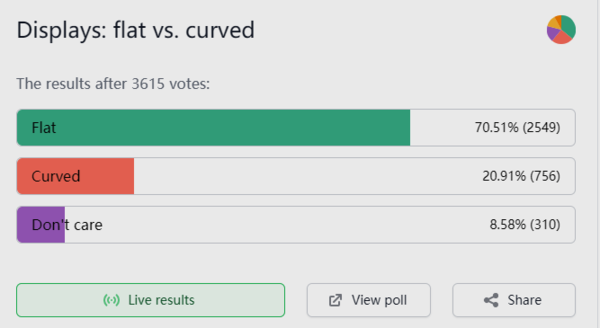 在曲面屏和直屏的选择上,70.52%的网友更加倾向于直屏,20.87%的网友更加中意曲面屏,有8.6%的网友对屏幕类型并无过多要求。曲面屏虽然在颜值和辨识度上略胜直屏一筹,但是从维修和使用体验等情况来看,总体并不那么令人满意。因此,出现上述的投票结果也并不令人意外。