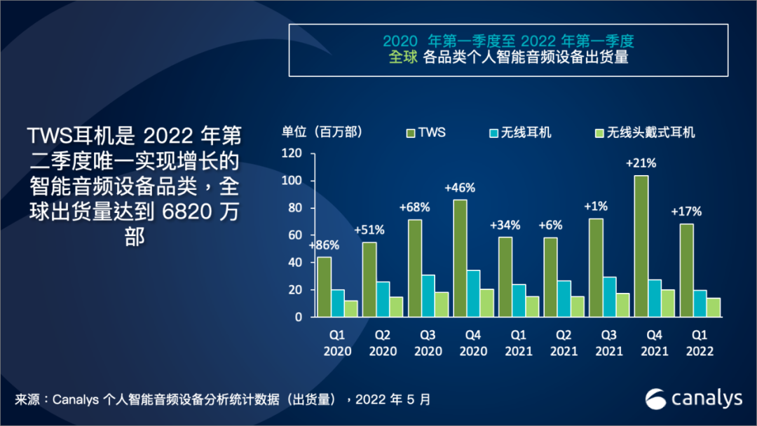 近日消息,根据统计机构Canalys数据,2022年第一季度全球真无线耳机(TWS)市场增长17%,达到6820万部,前三名品牌分别为苹果、小米、三星。值得一提的是,排行前三的TWS耳机厂商只有苹果实现了增长。数据显示,自2021年第三度以来,TWS耳机一直是唯一一个实现增长的设备品类,引领了全球个人智能音频设备4%的整体增长。