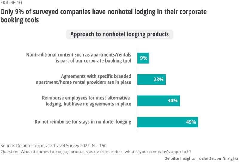 从2019年第四季度到2021年第四季度,Airbnb 的收益增长了38%,但租金上涨的加速并没有将它们大规模引入企业。在大流行期间,只有1/10的公司改变了与非传统住宿相关的政策,而做出改变的公司则不太可能接受非酒店住宿。大约一半的公司仍然根本不报销非酒店住宿。只有9%的公司在其公司预订工具中提供替代住宿选择。