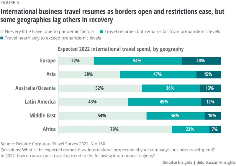 调查显示,国际旅行占2019年支出的1/4。美国旅行者的目的地中欧洲处于领先地位,近1/4的公司表示旅行频率将接近或超过大流行前的水平。超过一半的未来行程(54%)将恢复,但仍低于大流行前的水平。