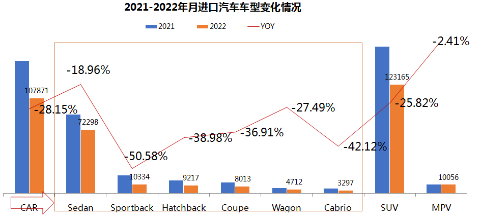 (六)车型结构:2022年1-4月,所有车型均出现不同程度的下滑,其中MPV由上月增长13%变成下滑2.4% ,轿车和SUV同比下滑幅度加快,分别达到28.2%和25.8%的下滑;Sedan车型同比降幅小于整体市场,而Sportback车型下滑达到50%以上。