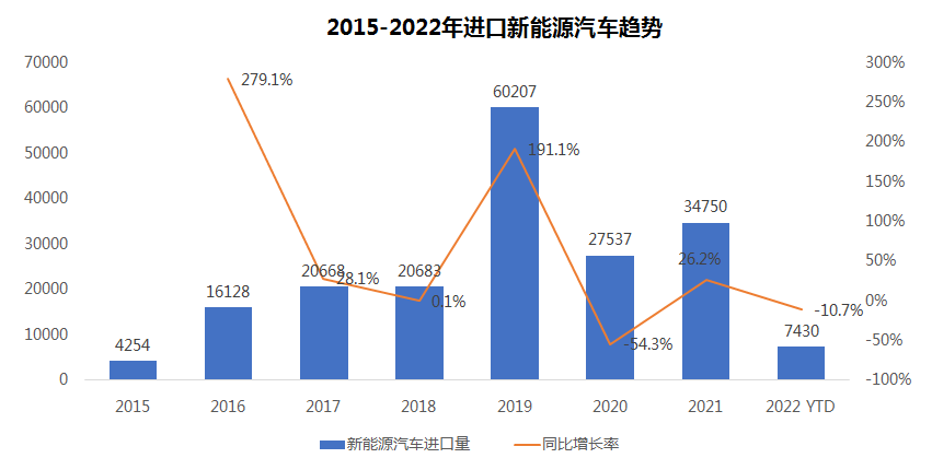(八)进口新能源汽车销售波动:2016-2018年进口新能源汽车销售在1.5-2.0万辆之间,在Model 3的带动下,2019年进口新能源汽车销售暴增至6万辆,同比增长191%,占进口汽车总量的5.4%;随着车型国产,2020年销售规模回落至2.75万辆,随着PHEV的贡献,2021年销售同比增长26.2%,2022年NEV销售7430辆,同比下滑10.7%,主要是由于纯电动下滑20.2%。