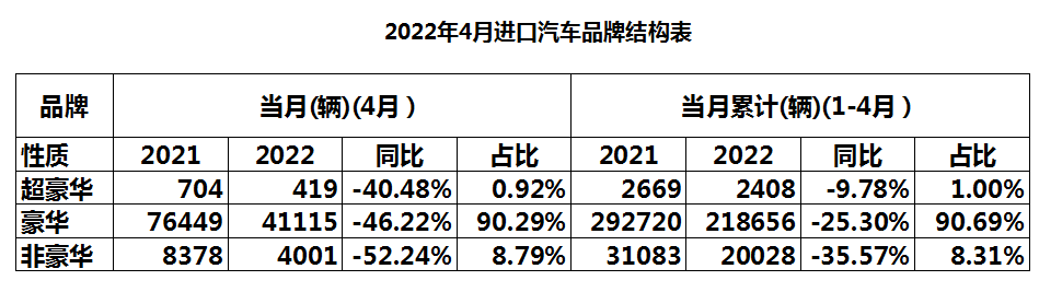(五)品牌结构:受疫情的影响,进口汽车市场整体大幅下滑,超豪华车、豪华车和非豪华汽车同比均下降50%左右,反映出防疫封闭对车市的整体影响。从1-4月累计来看,豪华车占比超过90%以上。