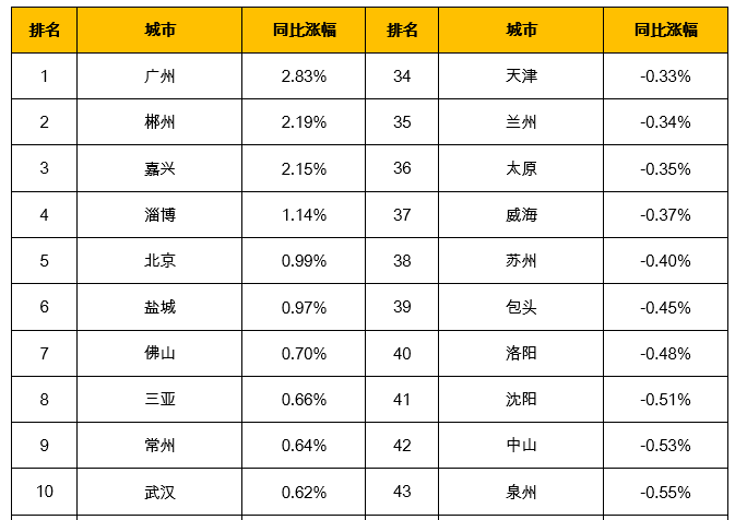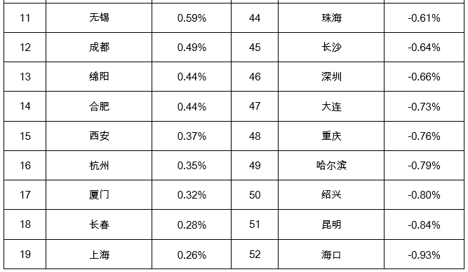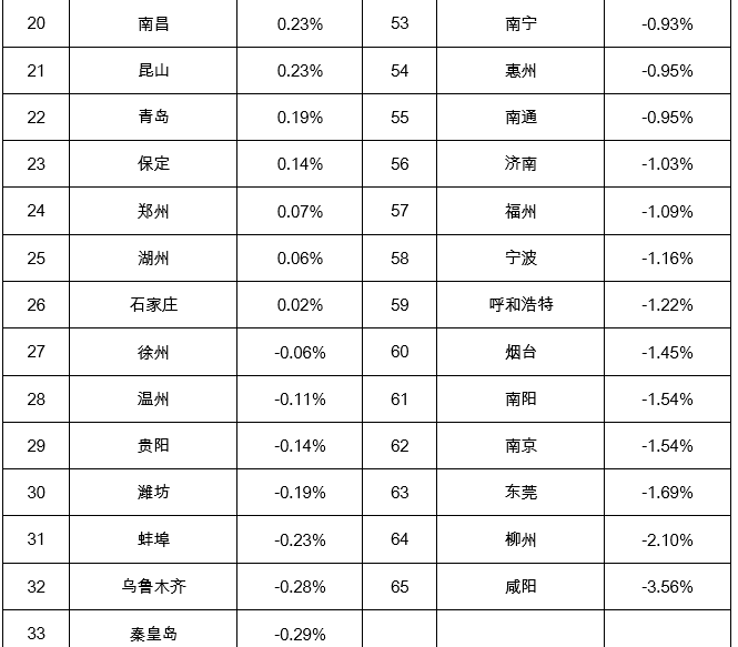 四、全国65城二手房挂牌价同比涨幅城市排行榜