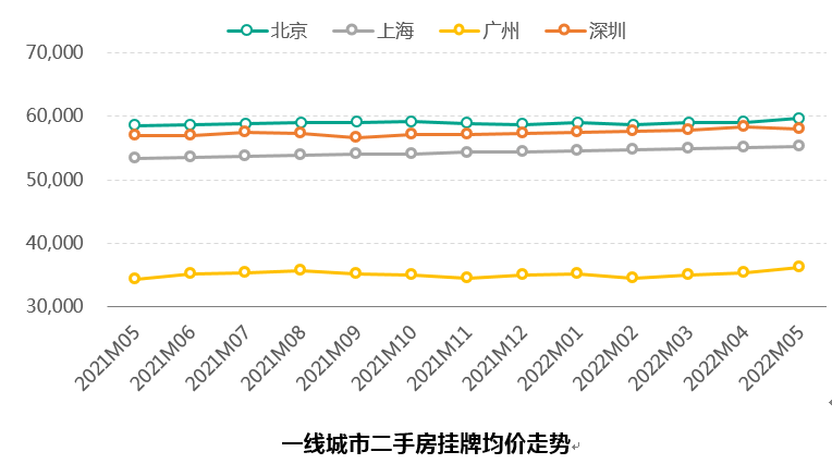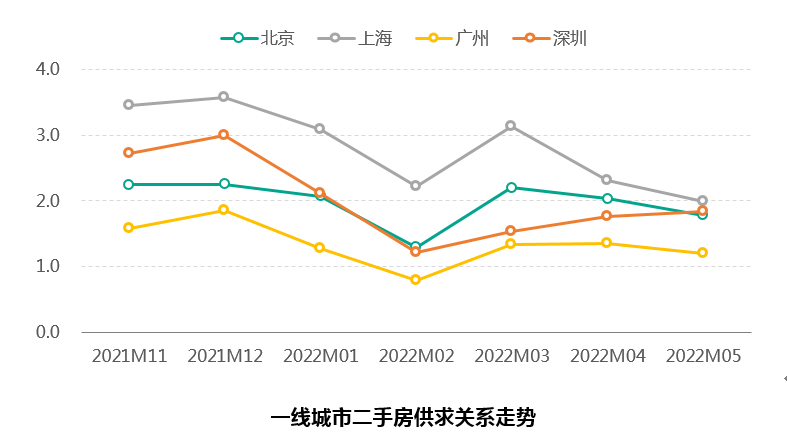 2022年5月,四个一线城市中仅深圳二手房市场供求比出现明显提升,其他城市的供需出现一定回落,北京、上海和广州的供求比出现回落的主要原因还是新增上架房源出现明显回落相关,而购房需求热度并为下跌,甚至广州的购房需求热度还出现明显回升。
