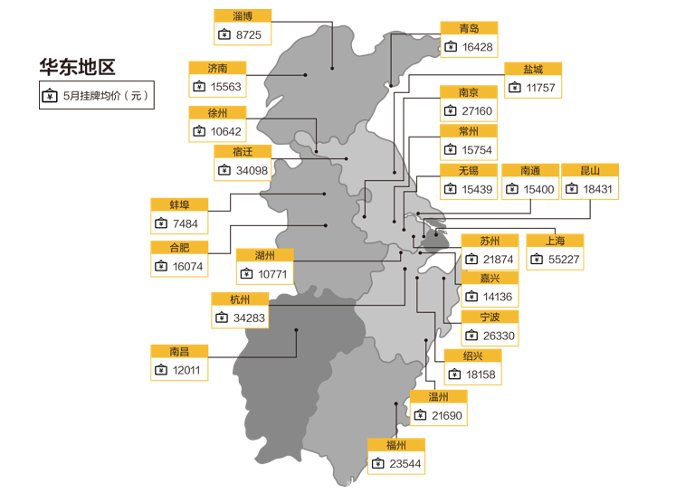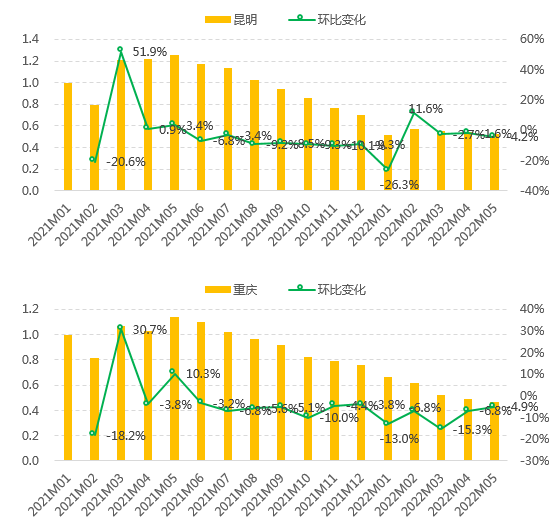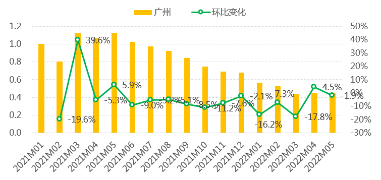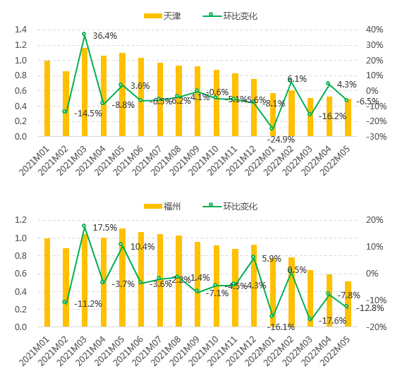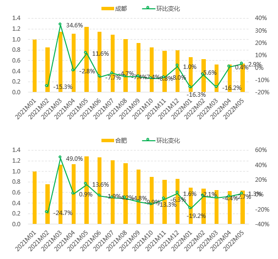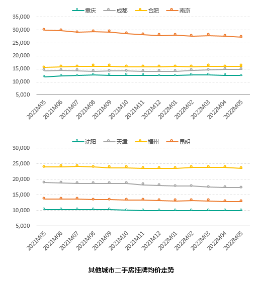 2022年5月,其他热点8城二手房挂牌均价环比上涨城市有2个,分别是成都和合肥,其他城市出现了不同幅度的回落,跌幅最大的城市为南京和福州,其跌幅分别为1.5%和1.1%,其中南京挂牌均价已连续两个月出现明显回落。