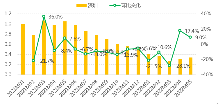 据58安居客房产研究院统计数据显示:2022年5月,一线城市中北京和上海受疫情影响,在架房源量持续出现明显回落,当前在架房源量都跌至历史低点。深圳市二手房在架房源量连续两周出现回升,表明市场信心在逐渐恢复。