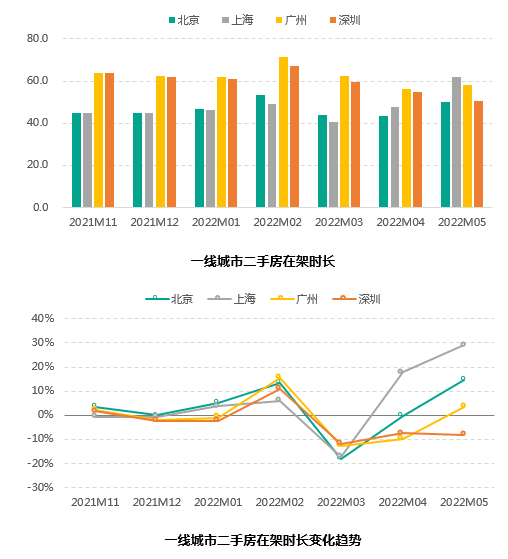 2022年5月,北京和上海受疫情影响,二手房在架时长出现明显增加,涨幅分别为14.6%和29.1%,其中上海的二手房在架时长已达到61.8天的历史高点。深圳的二手房在架时长持续出现回落,5月其二手房在架时长为50.4天,如果剔除春节假期的因素影响,已经连续5个月出现回落,时长活跃度明显提升。
