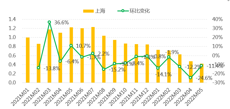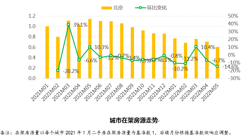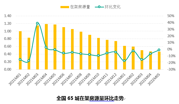 据58安居客房产研究院统计数据显示:2022年5月,全国65城二手房在架房源量环比下跌1.0%,二手房挂牌量连续出现回落。从目前二手房在架房源量走势来看,当前的在架房源量基本已跌至谷底,跌幅环比走势也逐步趋稳,随着房地产市场环境逐步向好,挂牌量也将出现回升。
