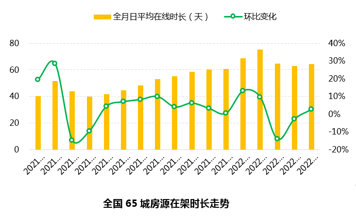 2022年5月,全国65城二手房在架时长为64.36天,环比增加2.6%。本月二手房在架时长出现小幅增长,主要还是由于部分城市疫情深度影响相关,如上海和北京的疫情对房源在架市影响较大,不过深圳二手房市场回暖依旧在持续中,二手房在架市场出现明显回落。