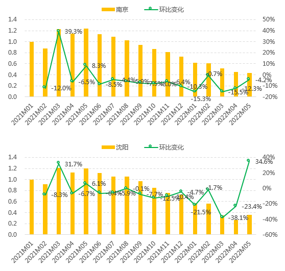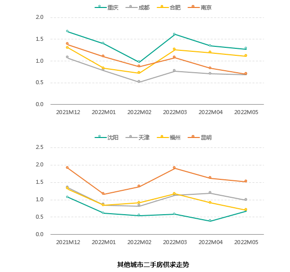 2022年5月,仅有沈阳的二手房供求关系出现出现明显上涨,其他城市供求关系都出现了一定的回落,其中这些城市需求热度出现回升是影响供求关系回落的主要原因,其次这些城市新增上架房源多数和上月出现了一定回落也影响到供求关系回落。