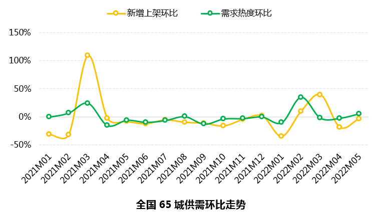 2022年5月,全国65城二手房新增上架房源环比减少3.2%,城市二手房购房需求热度环比增长5.5%。本月,二手房新增挂牌量出现小幅回落,与部分二手房集中城市疫情影响相关,如北京和上海新增挂牌量持续出现萎缩。其次,各个城市持续出台利好楼市政策的刺激之下,二手房的需求热度也出现了小幅回升。