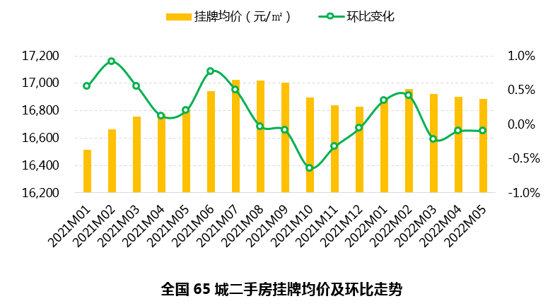 2022年5月,全国65城二手房挂牌均价为16887元/平方米,环比下跌0.10%,二手房挂牌均价连续三个月出现下跌。部分城市房东趁当前市场政策放松的情况之下,进行降价出货的一种情况,其次是进行置换,把自己的二手房先降价卖掉,也能够快速寻求更好的房源购买时机。