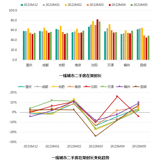 2022年5月,其他热点城市中,沈阳的二手房在架时长出现回落,跌幅为4.6%,其他城市都出现了不同幅度的上涨。目前在架时长最长城市为沈阳,其在架时长为78.29天,在架时长最短的城市为昆明,为49.07天。