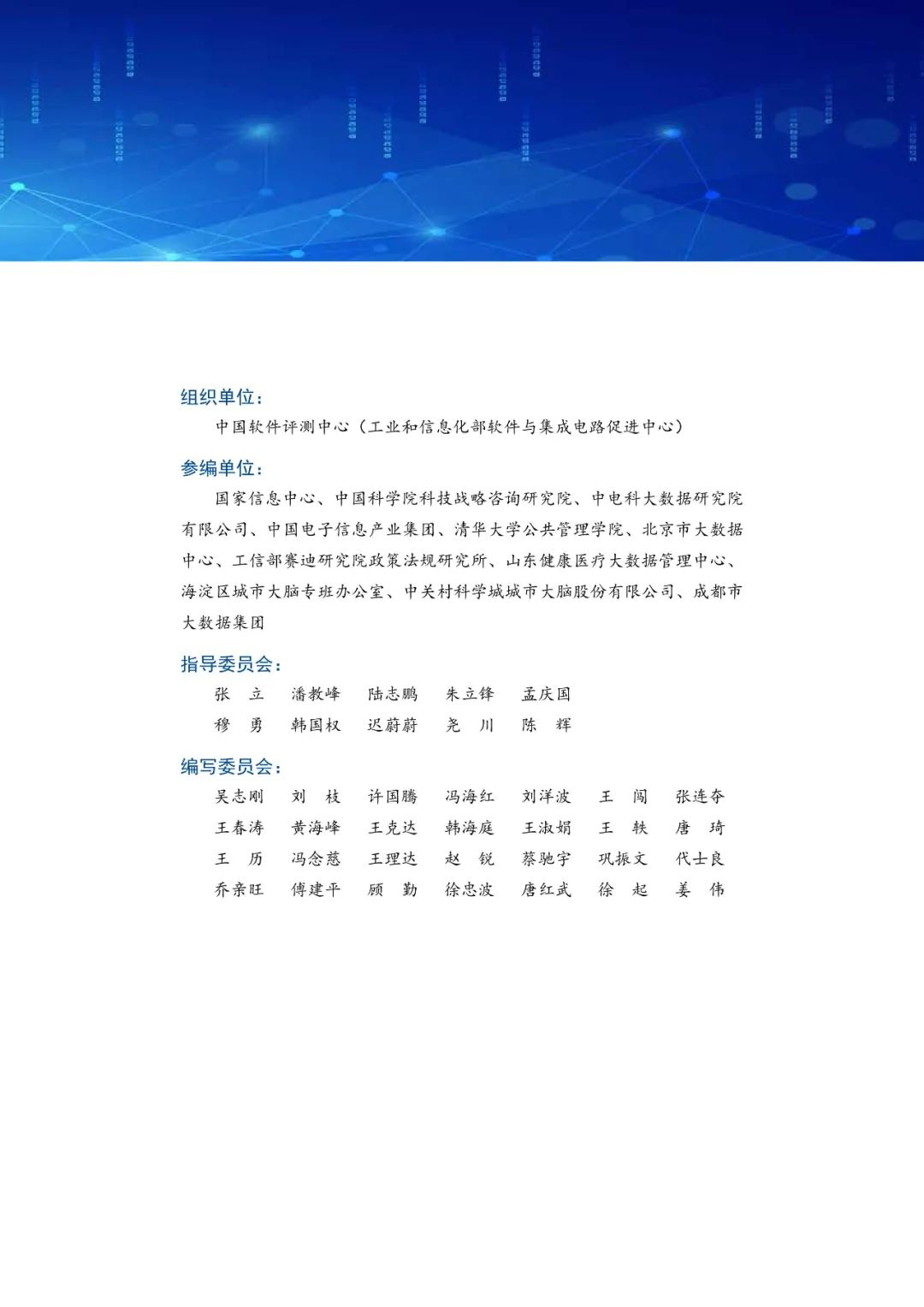 报告由中国软件评测中心(工业和信息化部软件与集成电路促进中心)牵头,参编单位包括国家信息中心、中国科学院科技战略咨询研究院、中电科大数据研究院有限公司、中国电子信息产业集团、清华大学公共管理学院、北京市大数据中心等10余家单位,编制过程中面向全国广泛征集了近20个典型案例。