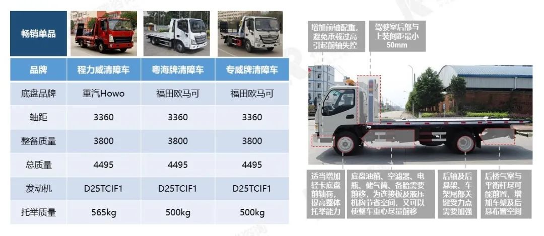 清障车是在轻卡载货车底盘基础上改装而成的,需要一些特殊性的改装,主要是底盘零部件的布置和局部受力点加强。