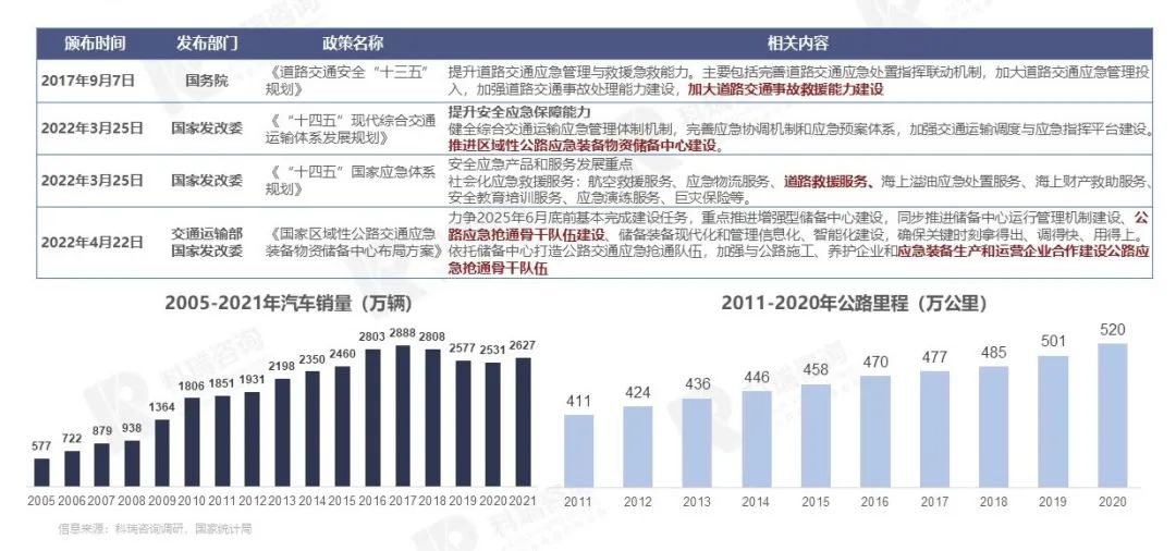 - 近几年来,随着机动车保有量的增加、道路总里程的增加,道路汽车救援,应急保障体系的建设尤为重要,清障车作为道路应急救援装备,利好政策也不断推出,产业化发展稳步提升,也给清障车快速发展带来机遇。