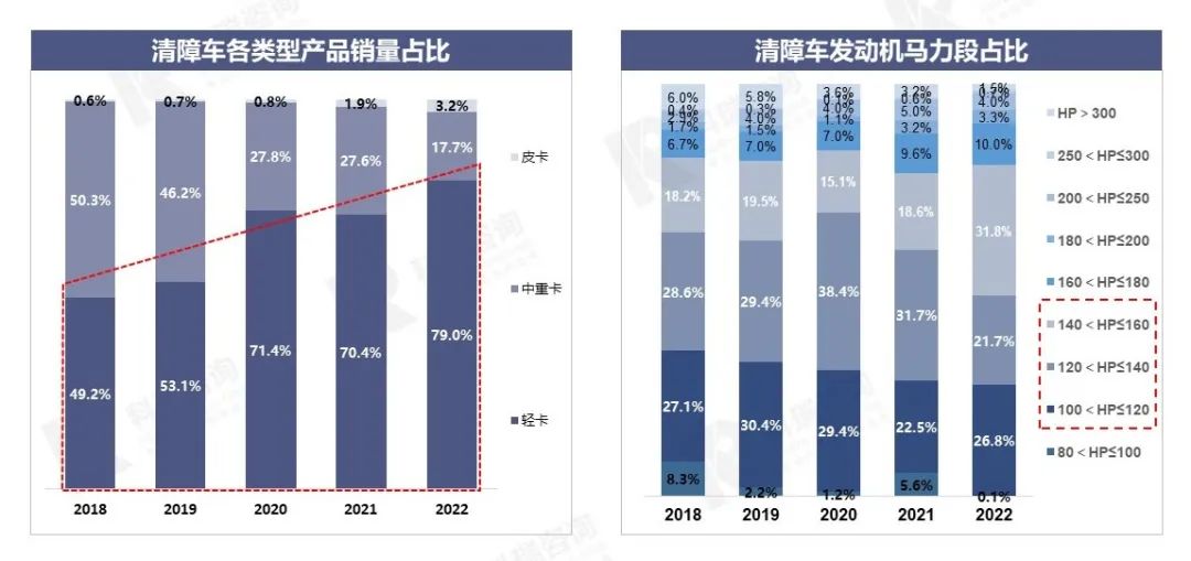 - 清障车近几年连续上涨,而且小型化趋势明显,轻卡清障车销量逐年增加、100-160马力产品占比超过八成,这部分车辆主要用于城市内乘用车、轻型商用车运输。