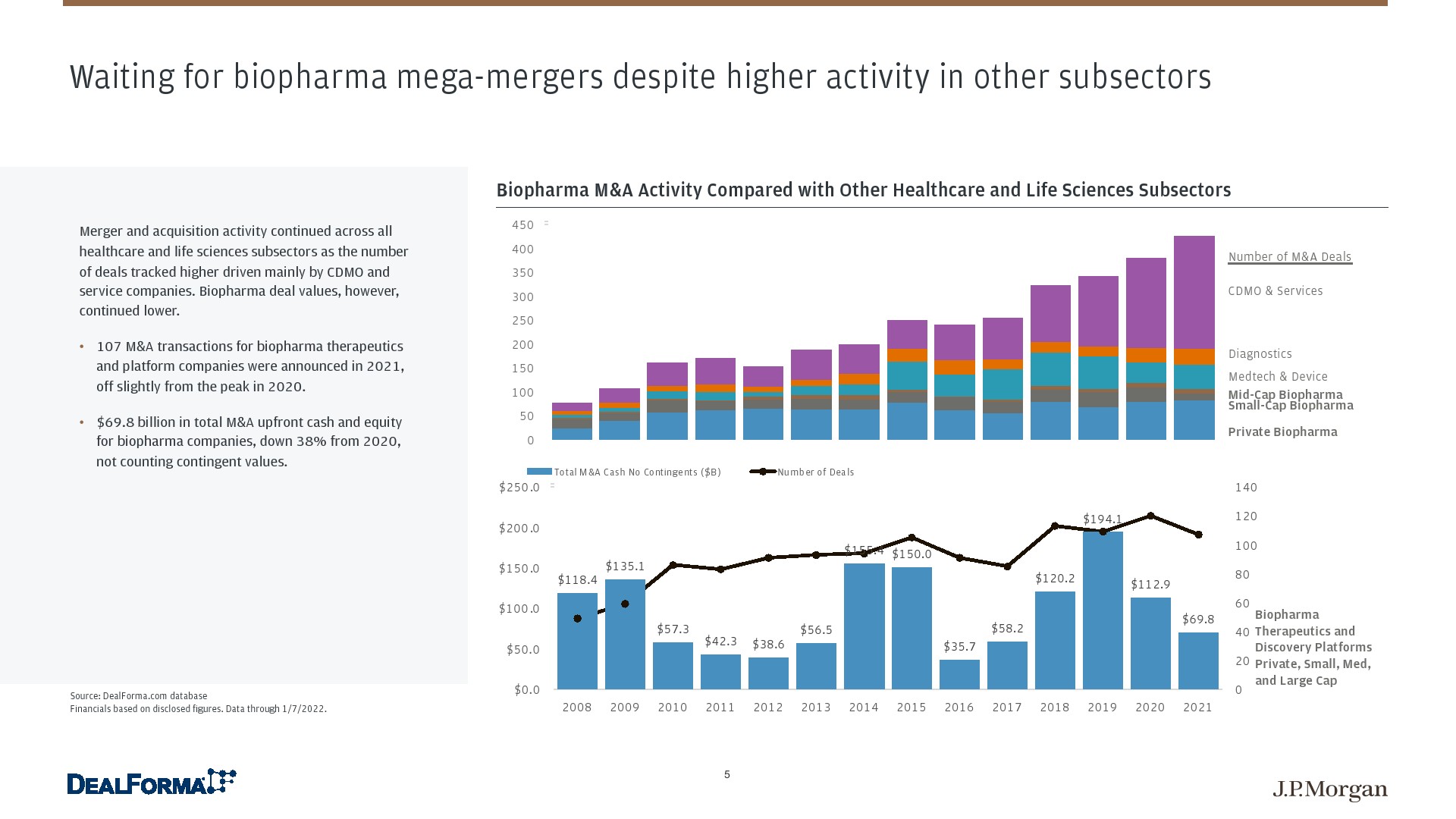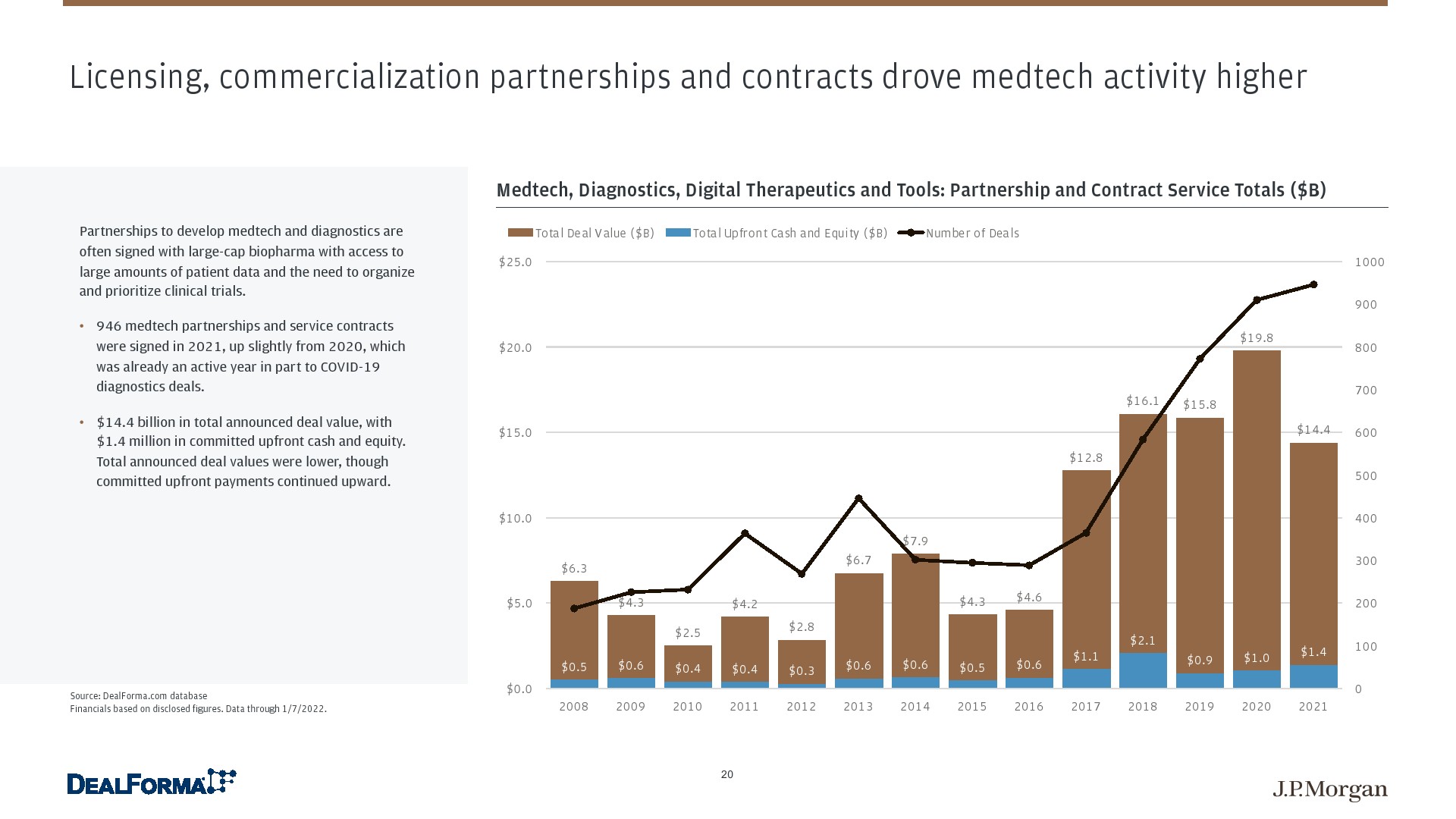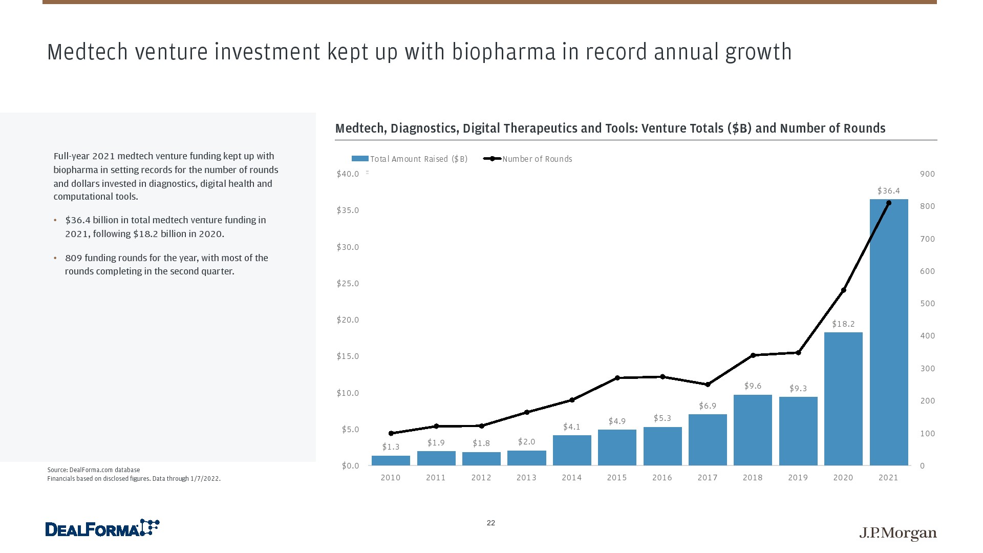 摩根大通发布了“2022年生物制药和医疗技术交易展望报告”。进入2022年,生命科学依然强劲。2021年是生命科学行业交易的又一个标志性年份。生物制药治疗和发现平台在许可和风险投资方面处于领先地位,而医疗技术交易活动仍远高于大流行前的水平。