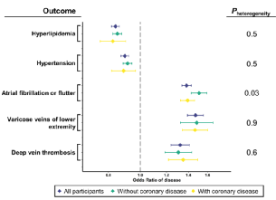 研究结果显示,在没有和有CHD的个体中,遗传预测身高与高胆固醇和高血压都呈现负相关性。心房颤动是另一种与身高相关的心血管疾病,但遗传预测身高与CHD和心房颤动、静脉曲张的关联方向相反,较高身高的人更可能患心房颤动和静脉曲张。研究发现,遗传预测身高与没有CHD的个体发生房颤的比值高于有CHD的个体,但没有观察到遗传预测身高与静脉曲张形成的关联存在异质性。