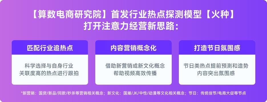 工欲善其事,必先利其器。对机会时点的把握是实现种草重要的一环,而目前商家仍缺少能与行业和营销场景匹配的内容种草工具,算数电商研究院首发的行业热点探测模型【火种】,既是“趋势雷达”系列课题研究中的底层应用模型之一,同时更是助力商家和达人通过捕捉热点实现创作灵感捕捉和种草的营销利器。