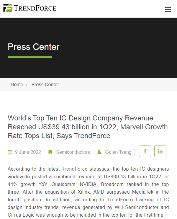 排名第三的博通(Broadcom),仅在 2022 Q1 迎来了 26% 的同比增长、至61.1 亿美元。紧随其后的是 AMD 则迎来了高达 71% 的同比增长、至 58.87 亿美元。