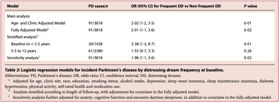 此外,在 12 年的总随访期间,研究人员确诊了有 91 例(2.4%)帕金森患者。而这些患者往往更容易抑郁且睡眠质量较差。在经过统计分析后,研究人员发现频繁噩梦参与者罹患帕金森的风险是普通参与者的 2 倍。