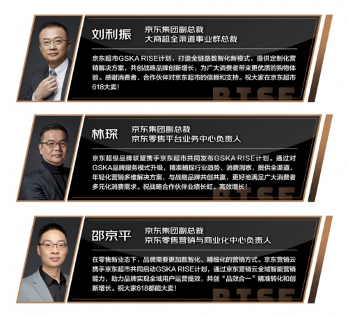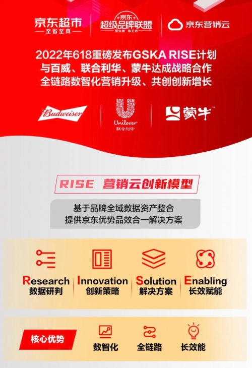 基于消费洞察、数字化营销布局,京东超市联合京东超级品牌联盟、京东营销云重磅推出GSKA RISE增长计划,通过R-Research(数据研判)、I-Innovation(创新策略)、S-Solution(解决方案)、E-Enabling(长效赋能),全方位提升营销驱动力,助力品牌实现品效合一创新增长。GSKA RISE增长计划的发布,也为驱动品牌增长提供了一条数智化的创新路径,为成为行业稳定器和孵化场带来更多可能。