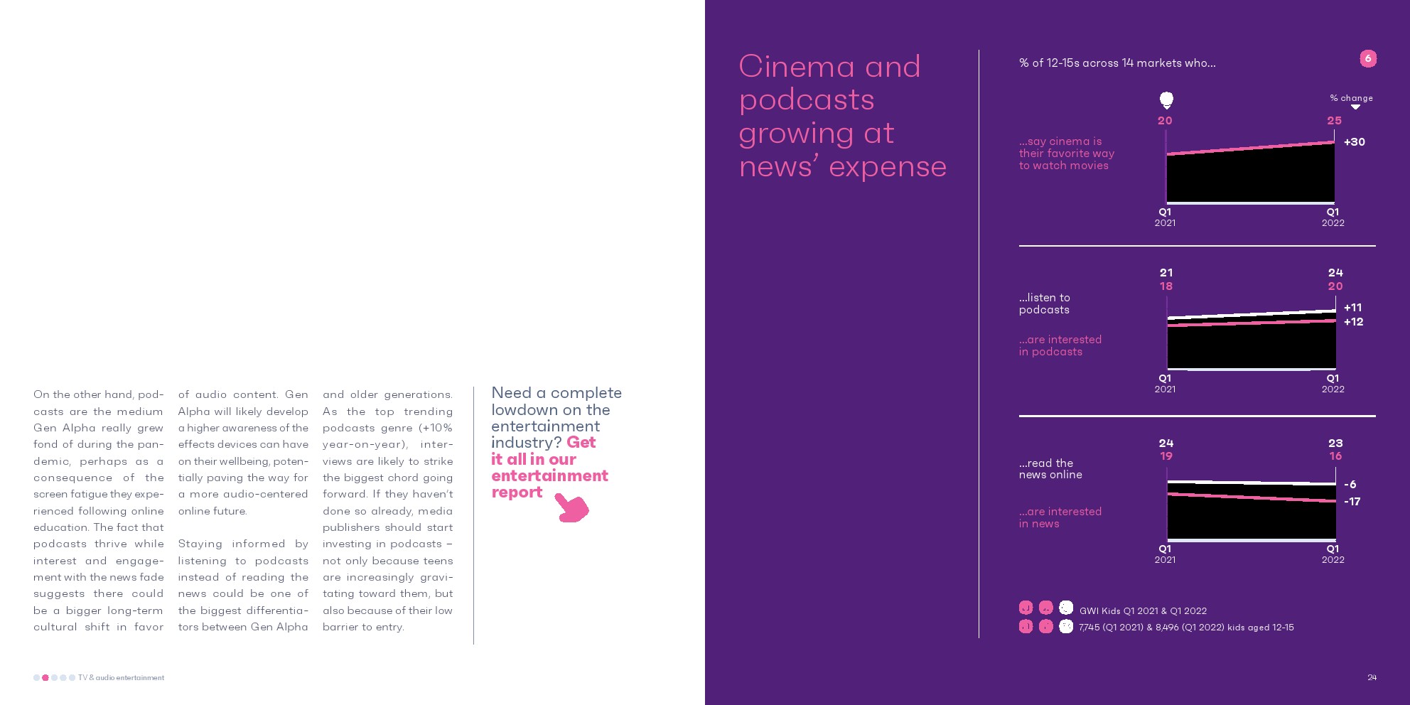 A世代正在离开较小的屏幕。他们越来越多地接受像播客这样的无屏幕活动或像电影院这样的大屏幕。播客在大流行期间尤其蓬勃发展,而对新闻的参与度却在减弱,这表明向音频内容的转变可能即将到来。