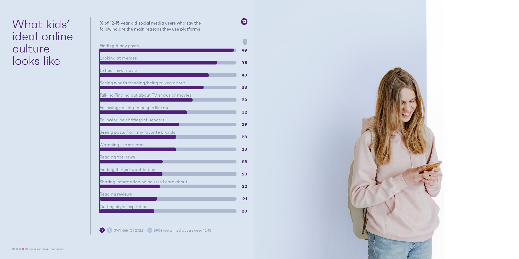 与成人相比,像 Roblox 和 Minecraft 这样的创造游戏在A世代的排行榜上排名更高。毫不奇怪,冒险和建设的机会是他们寻找的主要品质。孩子们显然很喜欢这些平台带来的好处:批判性思考、学习新技能和协作的机会。这为品牌引发基于社区的对话打开了另一扇大门。