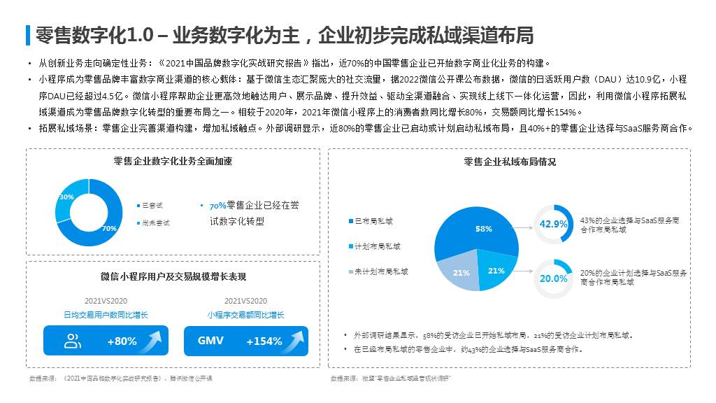 与此同时,在流量红利见顶、拉新获客成本高企的情况下,“私域” 成为品牌在布局数字商业时性价比较高的选择。《报告》数据显示,58% 的受访企业已开始布局私域,21% 的受访企业计划布局私域。在已经布局私域的零售企业中,约 43% 的企业选择与 SaaS 服务商合作。