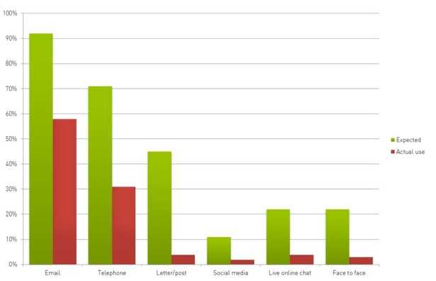 来自 eDigitalResearch的报告分析了用户跟企业打交道的渠道,以及他们对这些客户服务渠道的满意程度。该报告询问了2千位英国用户他们希望怎样跟企业联系。92%的人选择了电子邮件,然后是电话,有71%;邮寄则为45%。22%的选择在线聊天工具,只有11%的人选择社会化媒体。