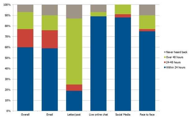 报告还发现不同的联系方式带来不同的响应速度。24%的客户沟通在6个小时内得到答复,有1/10的用户因为各种原因没能得到公司的反馈。社会化媒体是获得企业快速响应的最佳方式,可能是因为这是公众的论坛,企业会更加重视那些未回复的抱怨。