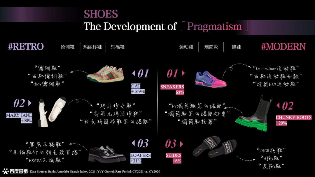看过了服装大类的趋势,接下来我们的视线转移到时尚穿搭的重要组成部分:鞋履。鞋履在去年有着明显的实用主义的倾向,放眼望去,搜索上涨的单品大多有一个共性,舒服好走。鞋履在整体风格上分为两大类,复古与时髦,TOP3上涨的产品线分别是复古风的德训鞋、玛丽珍鞋与厚底乐福鞋;时髦风的运动鞋、烟筒靴和拖鞋。