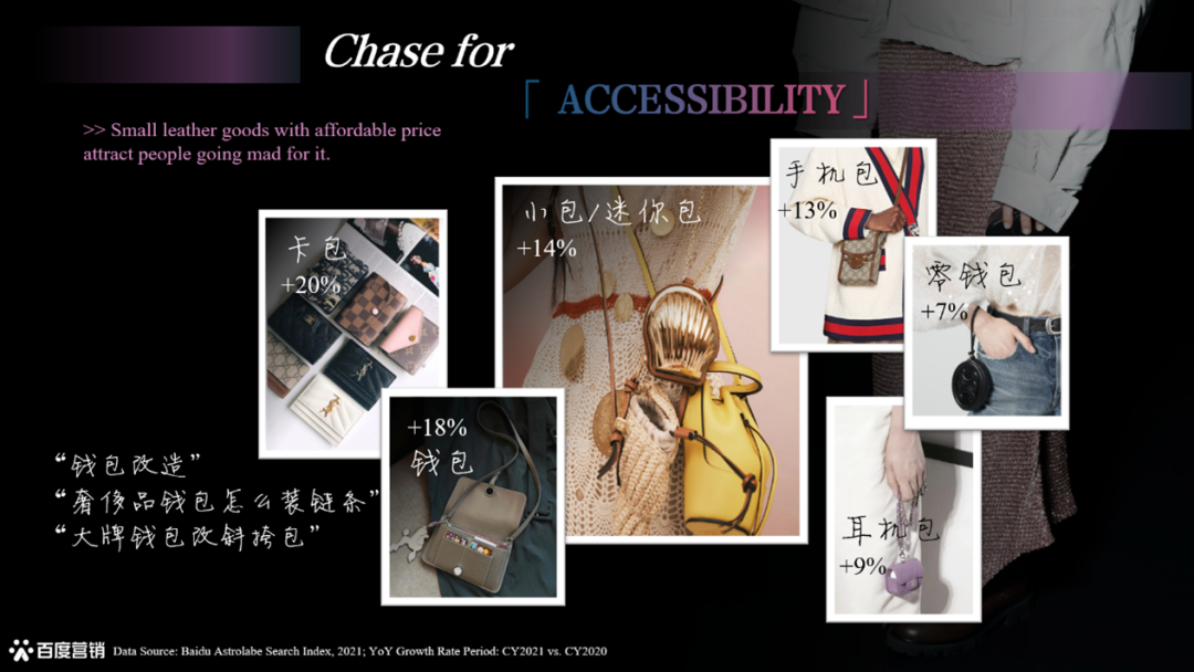 除了消费者日常背上身的奢侈品包包,我们发现近来更方便入手的小皮具逐渐成为了消费者们关注的新品类,无论是我们熟悉的卡包、钱包、零钱包,还是近两年为电子产品定制的小皮具衍生品手机包、耳机包都获得了不同程度的关注。消费者们也热衷搜索“钱包改造”、“钱包装链条”等内容,可见DIY小皮具也成为了当下的一股新风尚。