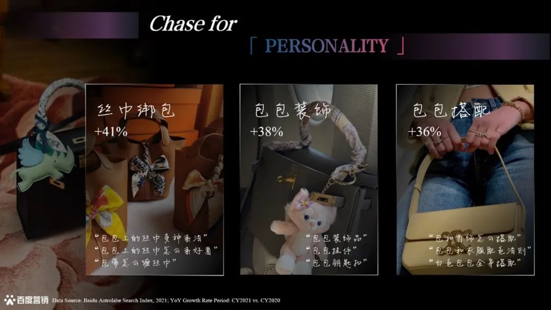 如今,追求个性化的消费者已经不满足于买包、背包,他们更热衷于为自己的爱包找到更好的装饰搭配,赋予包包更加能体现个人风格与个性的小心机。这其中:“丝巾绑包”、“包包装饰”、“包包搭配”是消费者最关心的三个主题。
