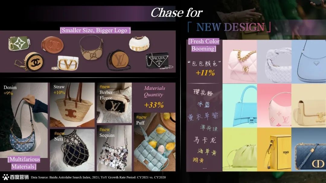 此外,随着包包本身设计的不断创新与探索, 消费者对于多样化材质的关注也日益增长。从数据中我们发现, 2021年,消费者提及的包包不同材质种类的数量同比上年增长了33%,这其中包括了持续走红的丹宁、草编材质,更有今年异军突起的网兜、羔羊绒、亮片和羽绒材质。这些或新颖或经典的材质,无一不赋予包包更丰富的造型个性和趣味性。