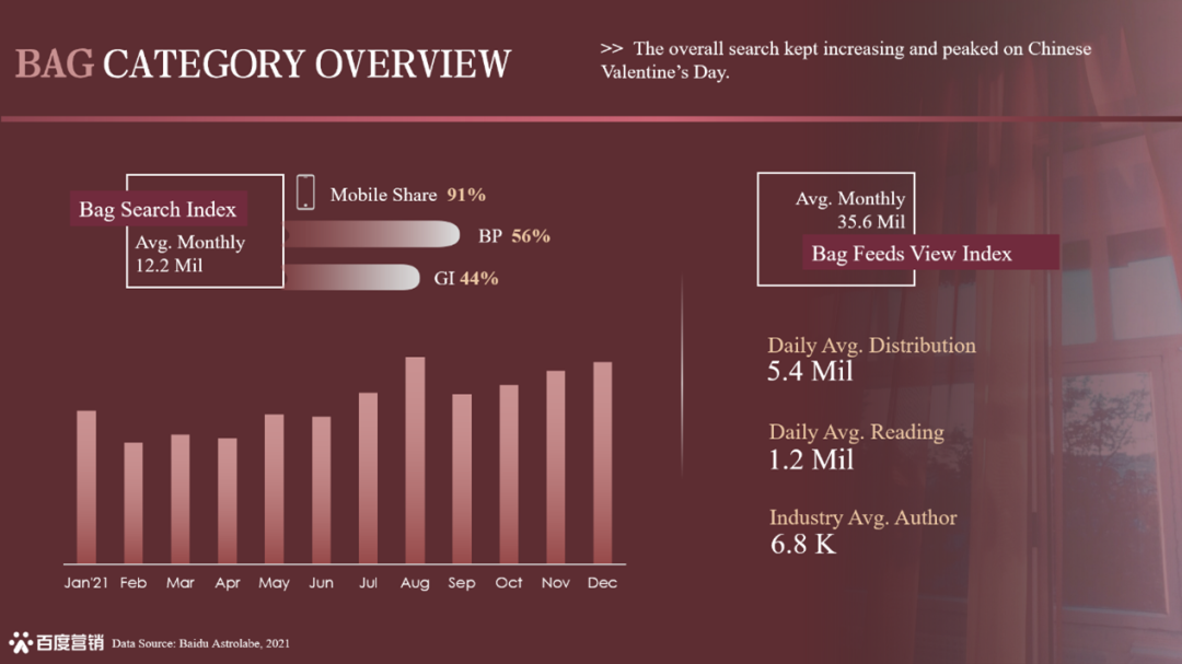2021年,包包的月均搜索指数达1220万,其中91%的检索来自移动端,与品牌产品相关的检索占比达56%,包包相关的通用词占比为44%。从分月检索趋势看,包包的检索高峰出现在七夕和圣诞。