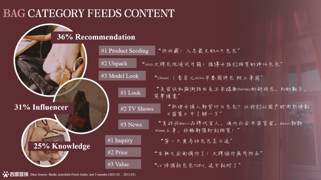 从信息流的内容分布上看,关于“种草推荐”的文章内容占比为36%,消费者通过百度信息流来了解当下流行、百搭的包包产品,也喜欢通过上身图、买家秀资讯种草;此外,消费者也越来越热衷于浏览明星资讯和热门时装剧有关的内容,“明星达人”的文章内容占比达到31%;同时,我们也观察到,近年来,消费者对于包包本身各方面的“知识点”也越发关注,25%的占比成为了第三大热门的信息流阅读内容。