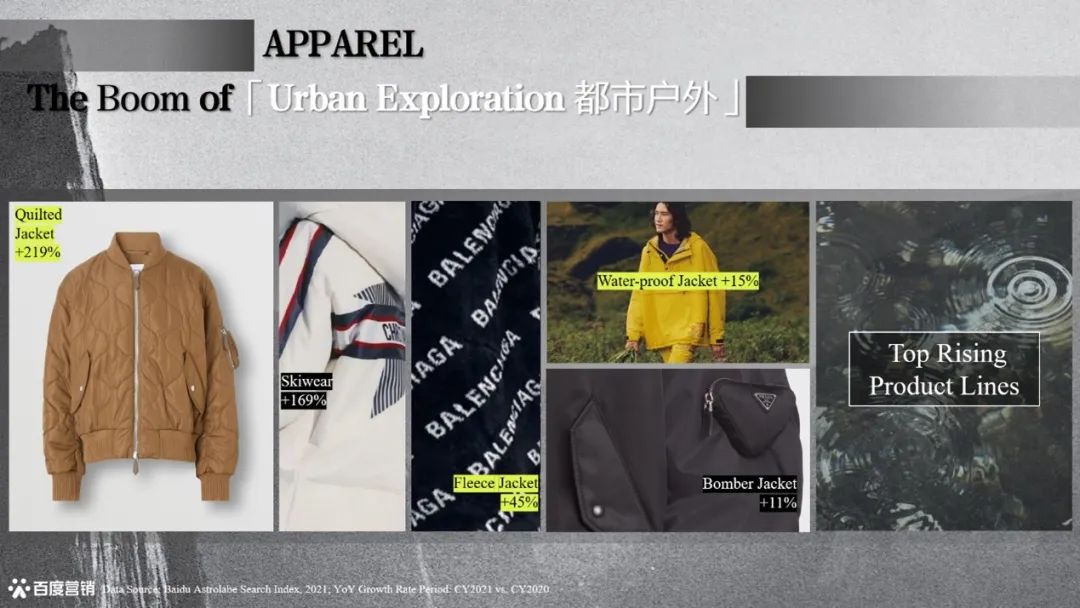相比女装,男装则是在都市户外这个方向发生了井喷式的增长,随着户外运动的流行,绗缝夹克、摇粒绒这些脱胎于专业户外服饰的元素在去年受到了追捧,融入了日常的服装中。同时,各大品牌也纷纷推出滑雪服、防水服和尼龙夹克这一类户外作战能力极强的单品,消费者的搜索指数也迅速上涨。