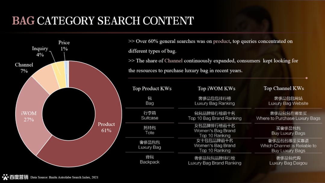 在包包品类的通用词搜索中,指数占比位居前三的分别是:产品、口碑和渠道。我们看到,近年来,消费者对包包获取渠道的关注持续提升。