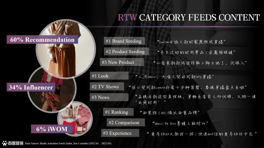 从信息流内容来看,消费者喜欢在百度上看到的是推荐种草、明星穿搭以及口碑排行相关内容,其中最受欢迎的推荐种草类,占比高达六成,大家习惯于在信息流的内容中接收各类品牌、产品与新品的安利。除此之外,关于明星名人的内容占据了34%的比重,风格不同的明星、idol总能成为大家的穿搭模板。