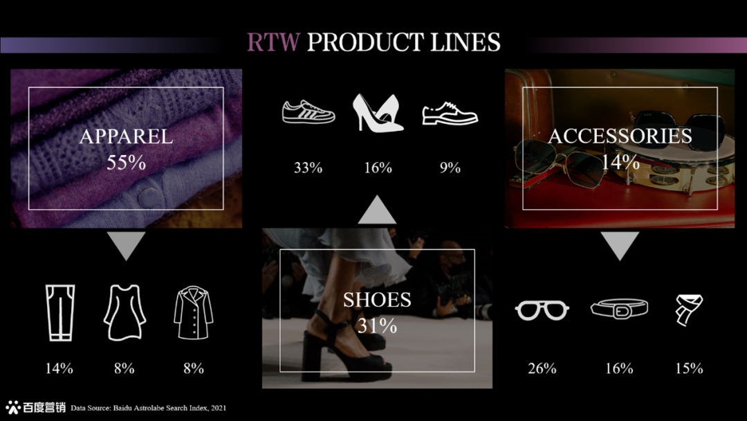 接下来,我们来关注一下成衣品类中的热门大类。排名第一的是服装大类,占比超过50%,其中排名前三的产品线是裤子、连衣裙和大衣;鞋履以31%的占比位列第二,配饰排在第三,其中眼镜与腰带维持了去年的相同排名,而围巾成为了今年的新风尚。