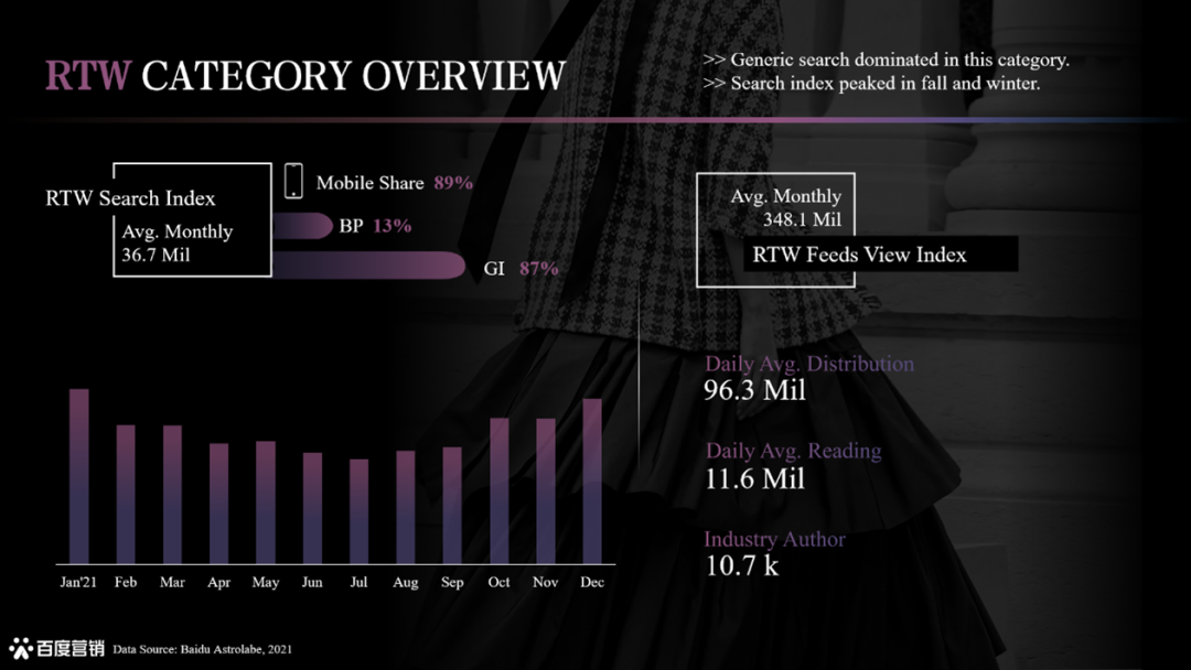 信息流则是随着全民皆是KOL风气的盛行,作者数量、月分发量与阅读量都有着明显的上涨,达到月平均3.5亿阅读指数,相关作者1.07万人,百度信息流正成为消费者获得成衣品类相关信息的重要渠道。