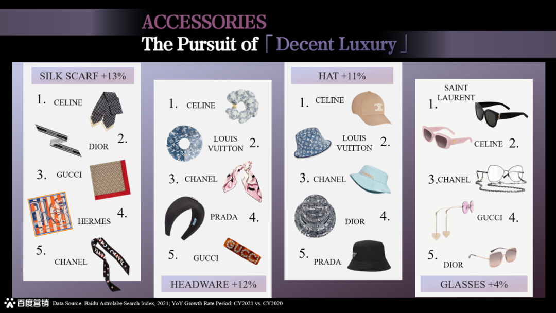 在最后一个品类配饰的趋势上,非常明显地呈现了细节化小件化的趋势,体现了消费者对“全面精致”更深入的追求:2021年,丝巾作为百搭单品上涨高达13%;上涨速度第二的是发饰产品,发丝级别的精致弥补了被口罩遮挡的美丽妆面,上涨12%;排名第三的是实用与搭配并重的单品——帽子,其后是时髦精必备单品眼镜与墨镜。