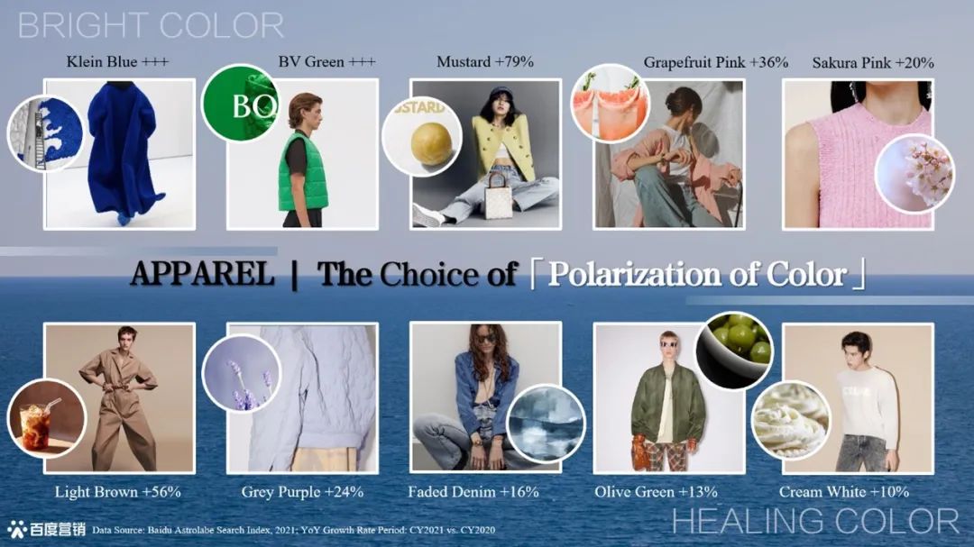 在服装的颜色方面,经历了疫情的大环境,消费者在颜色的选择上有了明显的两极分化的趋势,一部分人们希望用明亮的颜色来为生活增添活力,上涨排名第一的就是去年火出圈的克莱因蓝,以及少见的以品牌命名的颜色BV绿,另外芥末黄、西柚粉和樱花粉也上涨迅速;另外一类则是治愈系的颜色,是一种纯度偏低、让人感到柔软舒适的颜色,上涨前五的颜色分布是奶咖色、灰紫色、水洗蓝、橄榄绿以及奶油白。