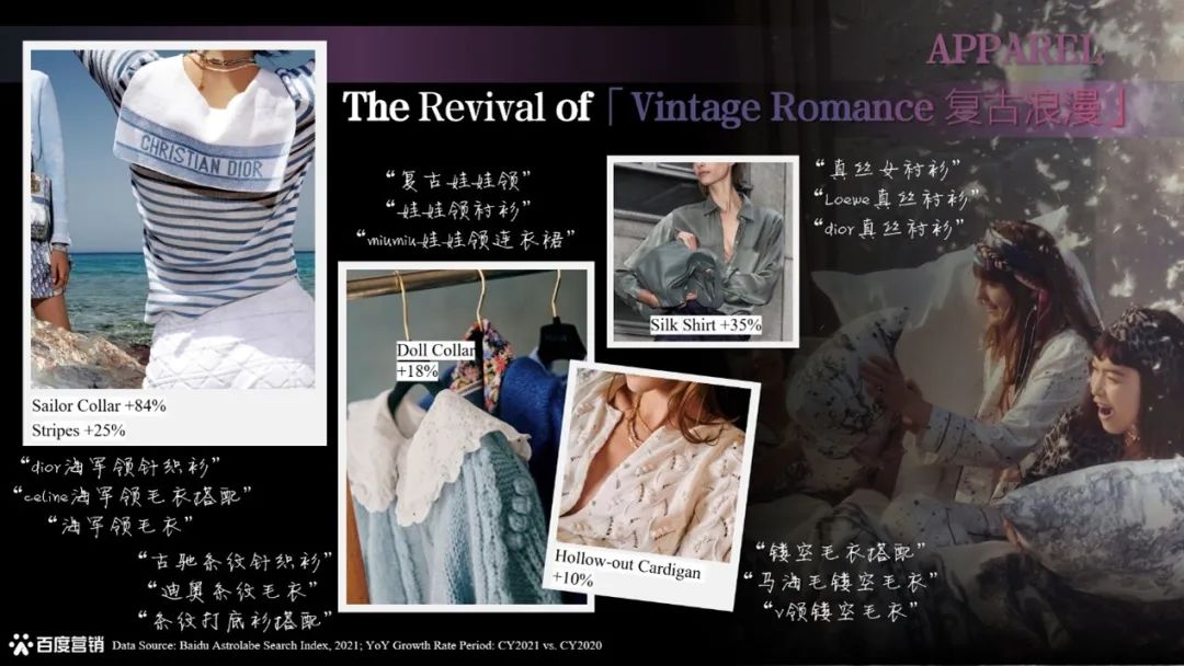 消费者开始向往南法轻盈浪漫的氛围,对复古元素海军领、条纹衫以及娃娃领都展现了明显的青睐,丝质衬衫与镂空毛衣等充满浪漫氛围的单品也大受欢迎。