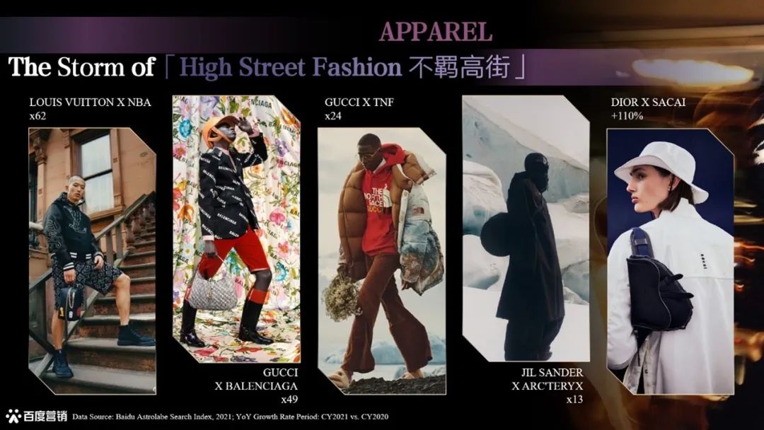 我们也盘点了近两年遍地开花的品牌跨界联名,其中21年搜索量上涨最快的五个合作分别是:2020年开始的LOUIS VUITTON与NBA的合作,在去年搜索量上涨了61倍;去年轰动一时的GUCCI与BALENCIAGA的HACKER和GUCCI与THE NORTH FACE的两次联名上涨分别高达48倍与23倍,排名第二与第三;排在第四位的是被誉为极简主义与户外服饰的绝妙配合,JIL SANDER和始祖鸟的合作上涨12倍;DIOR和日本小众品牌SACAI的合作上涨110%,排名第五。