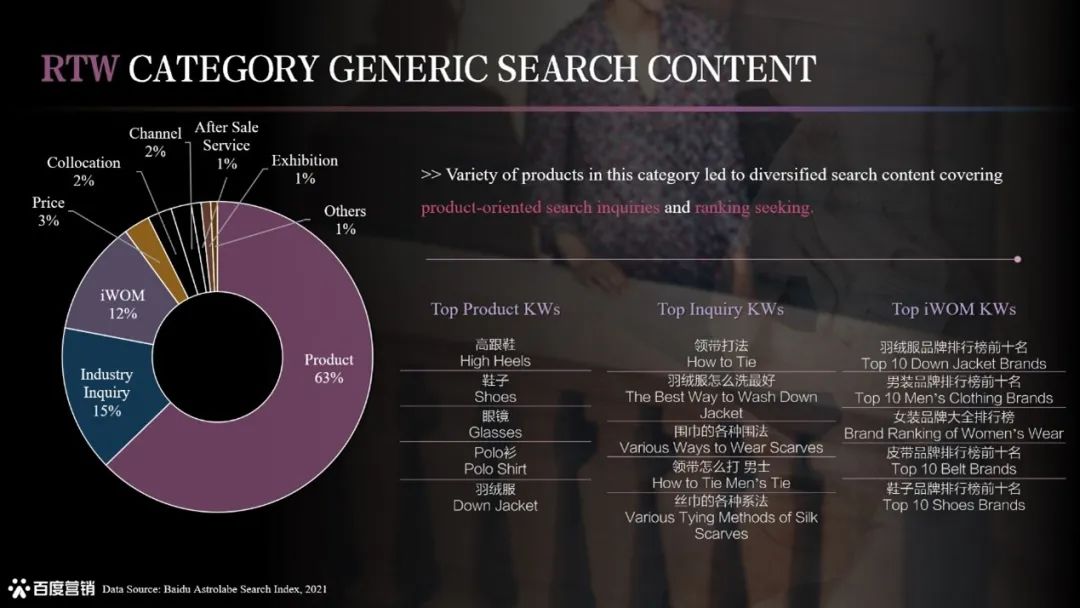 从成衣的通用词搜索来看,服饰品类是一个以产品搜索为主导的品类,由于产品细类众多,仅产品词搜索份额就高达63%,除此之外,行业询问词和口碑词依旧是大众极为关注的话题,其中行业询问词主要集中在使用方法的询问,例如围巾领带的系法等,口碑词则是明显体现了消费者对于百度品牌排名的依赖。