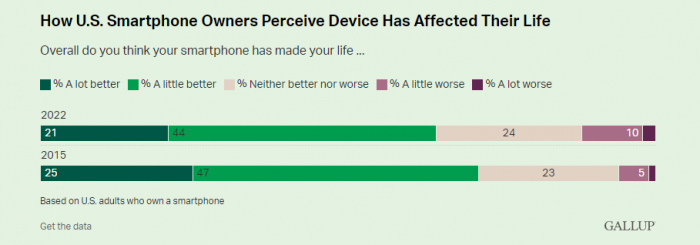 即使美国人认为他们过度使用智能手机,但仍有近三分之二的人认为他们的智能手机使他们的生活变得更好–21%的人说智能手机使他们的生活“好很多”,44% 的人说智能手机使他们的生活“稍微”好一点。与2015年72%的人认为有净收益相比,这一比例略有下降。